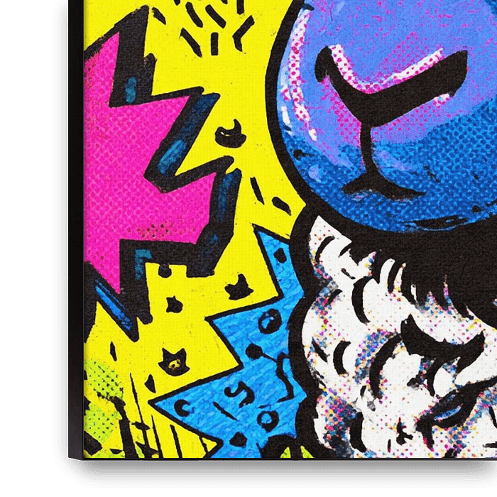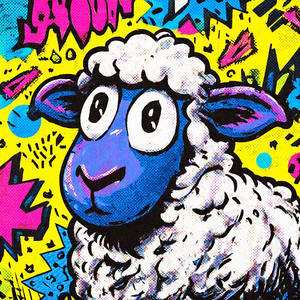 This artwork depicts a playful and expressive sheep that immediately catches the eye with its blue face, large eyes and fluffy white coat. The animal takes centre stage in an explosion of colour and dynamism, surrounded by bright hues such as yellow, pink, blue, purple and black. The background consists of comic-style shapes, halftone…