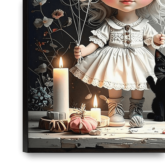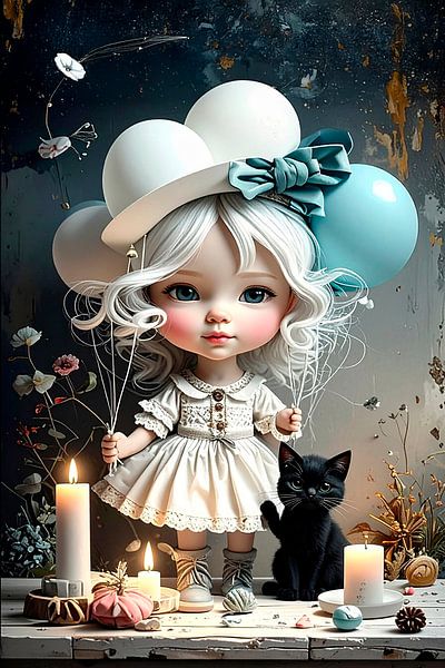 A cute doll, with big eyes, a white lace dress and a hat with balloons, stands on a table with a sweet black cat and burning candles next to her. The background is artistic and abstract. The whole scene has a dreamy fairy-tale feel. The image was generated using ai.