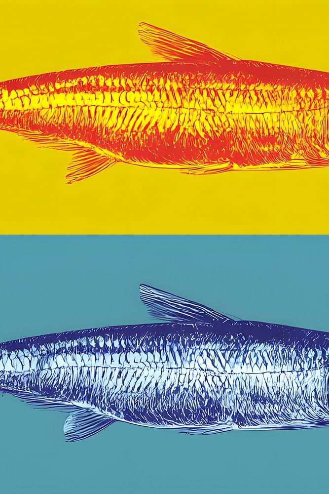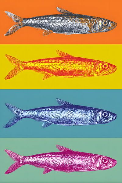Four stylised fish are arranged horizontally, each set against contrasting coloured stripes in orange, yellow, blue and green. The illustrative style is reminiscent of Pop Art and screen-printing aesthetics, with clean lines and minimal detail. Despite their identical shape, each fish appears distinct due to its colour scheme. The…