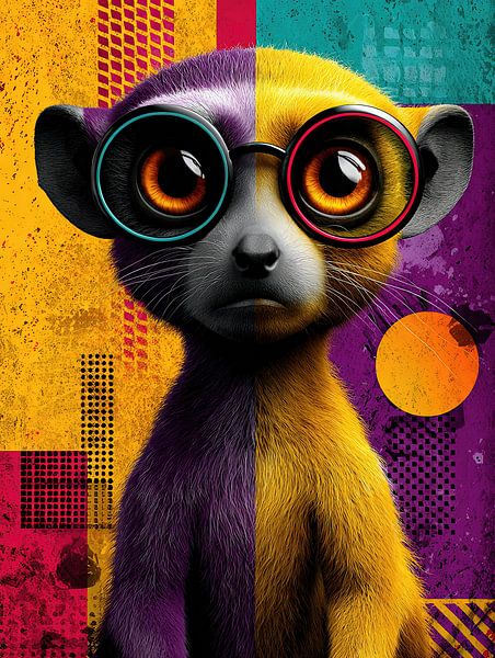 This pop art portrait stages an animal creature as a visual field of tension between two identities. The body is strictly divided vertically, each half follows its own world of colour, its own logic. Cool violet and turquoise tones dominate on the left, warm yellow, orange and magenta on the right. The division is not an effect, but a…
