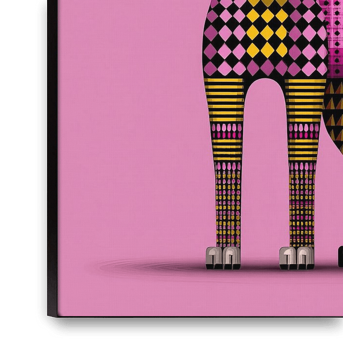 This work shows a stylised animal figure that is deliberately positioned in the field of tension between pop art, graphic abstraction and iconic clarity. The figure stands frontally, calmly and confidently in front of a monochrome, pink-coloured background. This removes it from any narrative context and presents it as an independent…