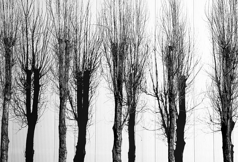 An alienating photograph as the shadows stand out against a white background of a corrugated iron shed.