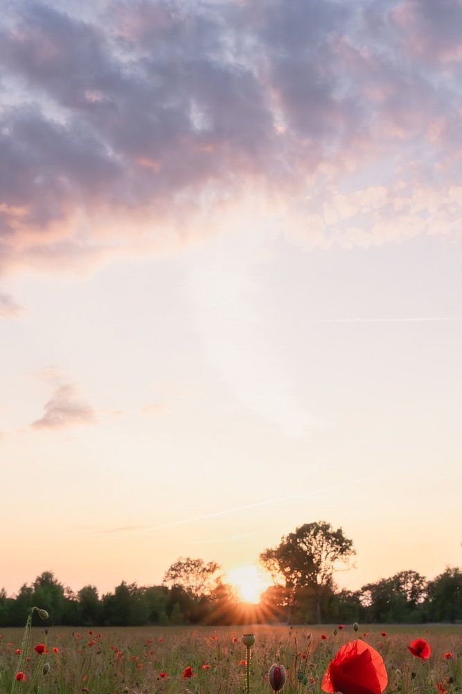 This work depicts a vast field of poppies bathed in the last light of day. The setting sun is just sinking behind the treeline, casting a warm, soft glow over the red flowers. This makes the poppies stand out subtly against the fresh green of the grass and the cool blue hues of the sky. The vertical composition gives ample space to the…