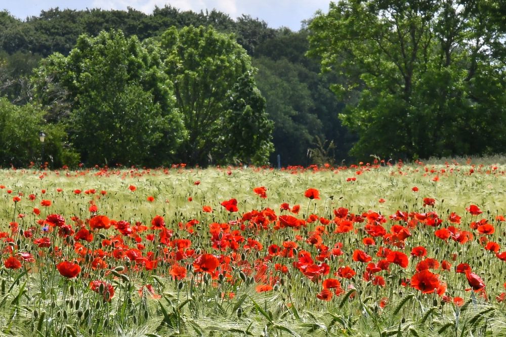 Usually a field of ears is green as far as the eye can see. Not so now. Poppies add colour and accent to a predominantly green environment.