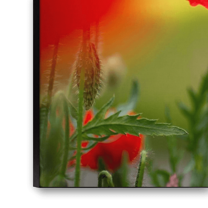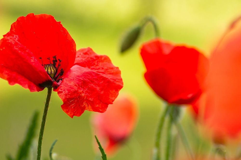 Photo taken of a set of poppies in spring. The spring is bursting out of them with all its red hues. You can clearly see the fragility of the delicate flowers. Red is the main colour.