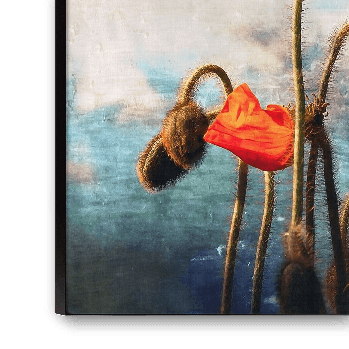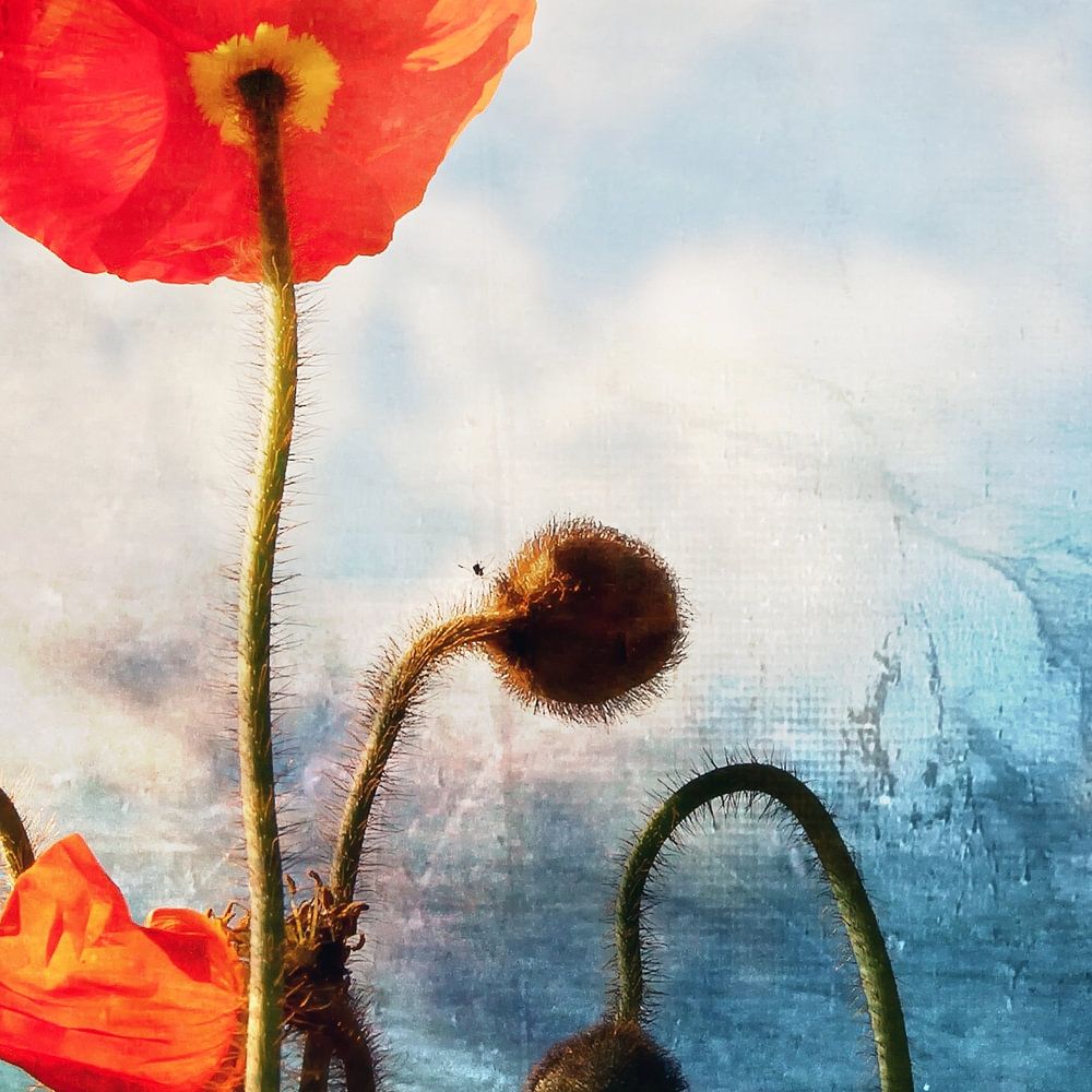 A vibrant red poppy flower stands tall against a background featuring soft blue hues and a dreamy, cloudy abstracted sky. The stems and buds add depth to the scene.