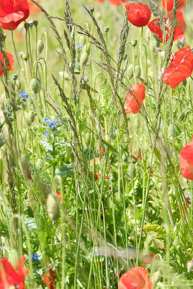 Poppy flower with red petals. Field of poppies. Red flowers with green leaves. Early summer flowers.