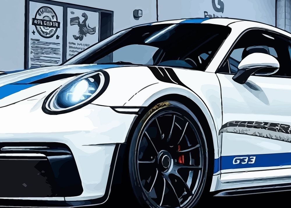 Buy this digital art artwork Porsche 911 GT3 RS White Blue by MIROKKU as a reproduction on canvas, ArtFrame, poster and wallpaper, printed on demand in high quality.