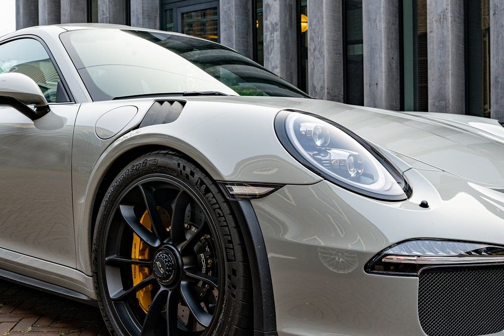 Porsche 911 GT3 RS sports car generation 991 in grey. The GT3 RS is a lightweight performance version of the Porsche 911 with improved aerodynamics. Porsche 991 GT3 RS with its naturally aspirated 4.0-liter flat-six engine, is highly regarded for its ability to deliver a thrilling and engaging driving experience, both on the road and on the track. It combines Porsche's engineering excellence with a dedication to performance.