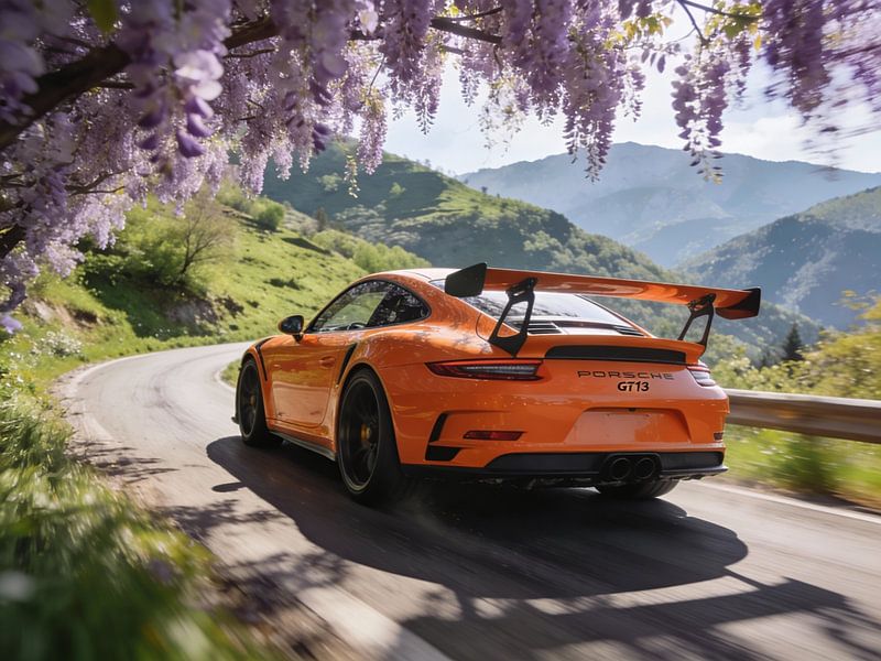 The Porsche 911 GT3. Its sleek lines, aggressive splitter and iconic rear wing cut through the air. Intense sunlight creates sharp shadows on the muscular bodywork. Perfect grip, pure precision-breathtaking high-performance photography