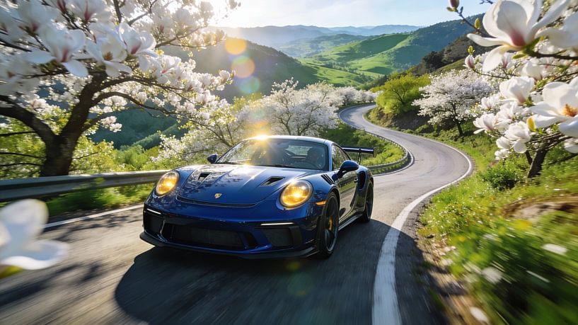 The Porsche 911 GT3. Its sleek lines, aggressive splitter and iconic rear wing cut through the air. Intense sunlight creates sharp shadows on the muscular bodywork. Perfect grip, pure precision-breathtaking high-performance photography