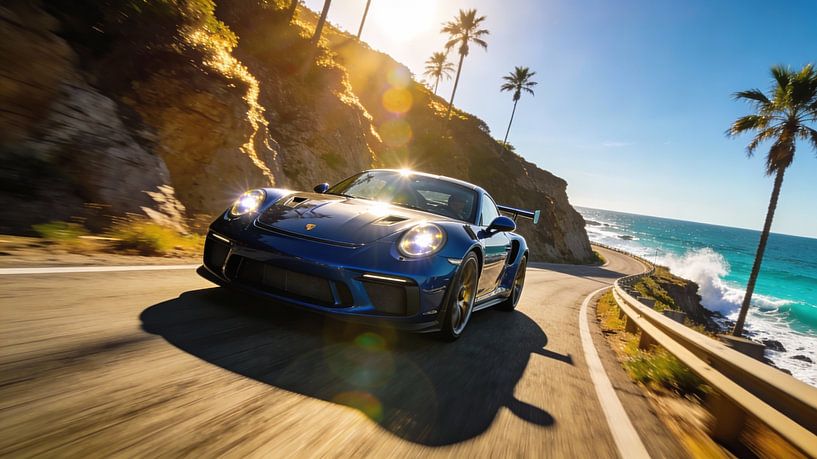 The Porsche 911 GT3. Its sleek lines, aggressive splitter and iconic rear wing cut through the air. Intense sunlight creates sharp shadows on the muscular bodywork. Perfect grip, pure precision-breathtaking high-performance photography
