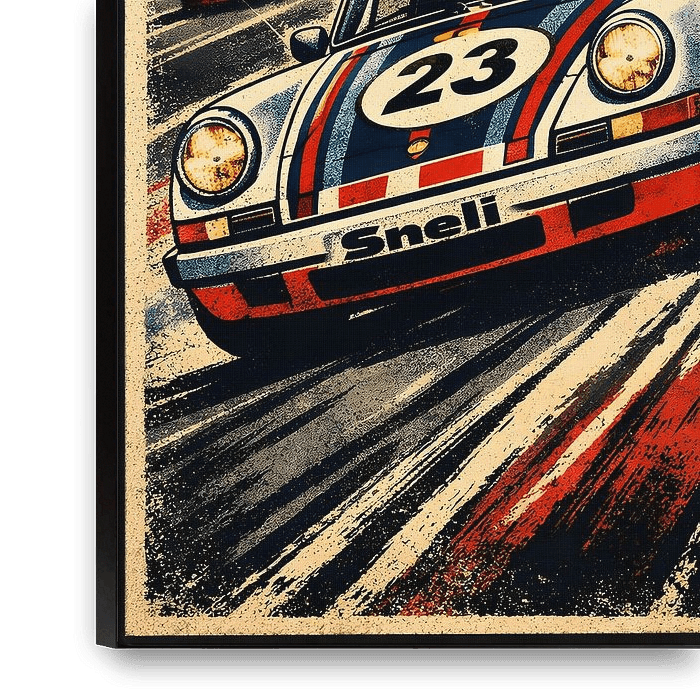 Vintage-style racing illustration featuring the iconic Porsche 911 on a classic motorsport track. Dynamic motion, bold retro colors, and textured print aesthetics capture the spirit of racing heritage. Perfect wall art for car enthusiasts and vintage decor lovers.