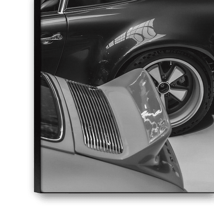 a photo of a number of Porsche 911's in a line, considering the time the cars're from, I think it is a cool detail to take the photo in black and white. I feel that this is how the photo looks best and will fit nicely into different interiors.