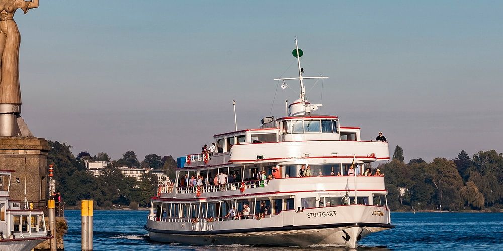 Imperia and the excursion steamer STUTTGART in the harbour of Constance at Lake Constance.