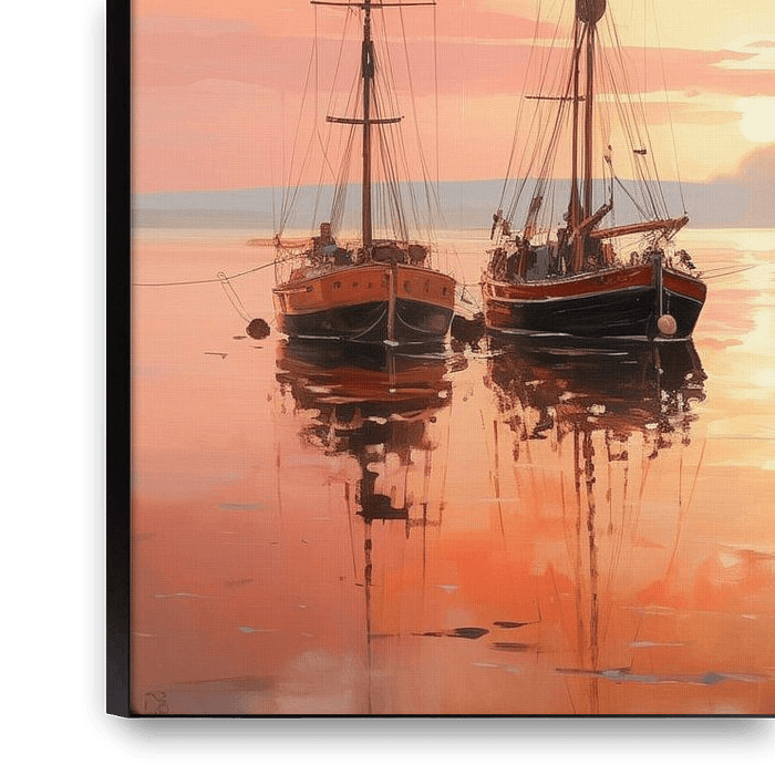 Impressionist painting of a historic North Sea port at the end of the day.
