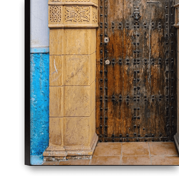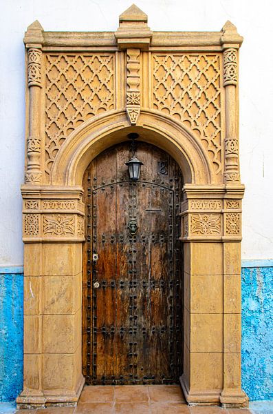 Magnificent sandstone-coloured portal with brown door in the medina of Rabat Morocco