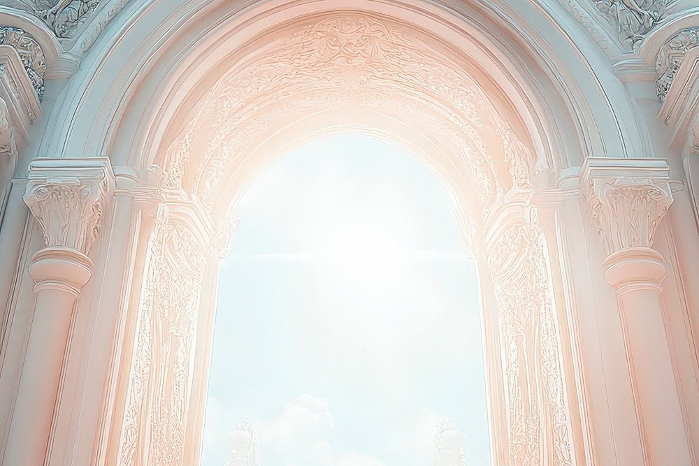 A majestic entrance to a heavenly world unfolds beneath a gentle sea of clouds. The radiant glow of light and the ornate details of the portal invite you to dream. Ideal for the bedroom to create an atmosphere of calm and inspiration that invites you to relax and meditate.