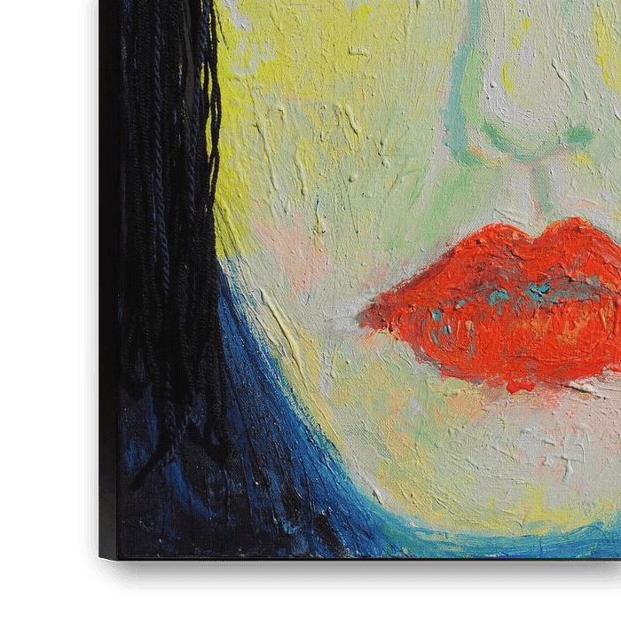 The version of the original work is painted with acrylic paint on canvas. The woman's hair has been applied with black wool, adding a special touch and sealing the face like a passe-partout.