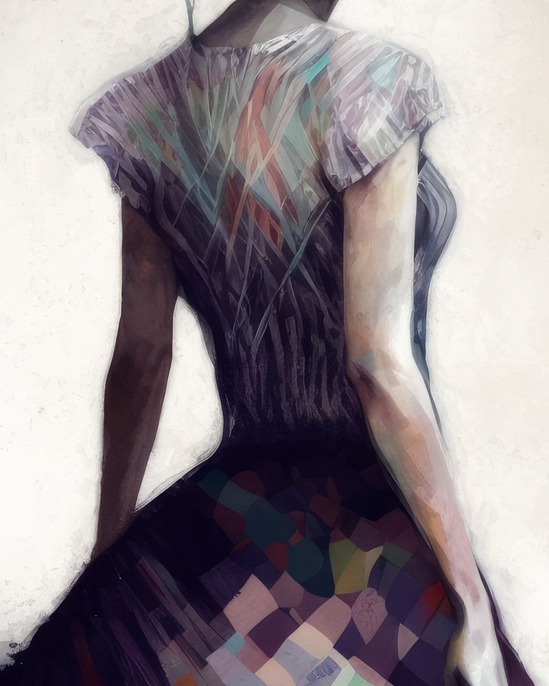 Illustrated portrait "Color me purple" in mainly shades of purple. drawn woman, seen from the back, which wears a dress with coloured geometric shapes in pastel colours.