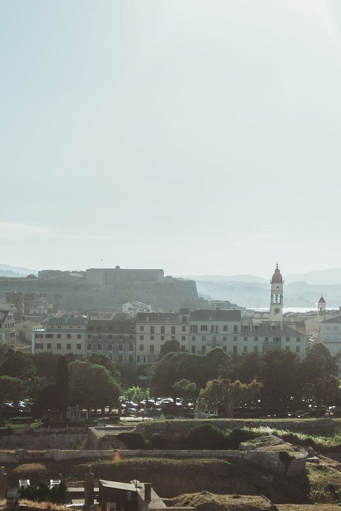 Greek architecture of Corfu Town. Through the walls of the Old Fortress, I photographed a beautiful portrait of this old town.