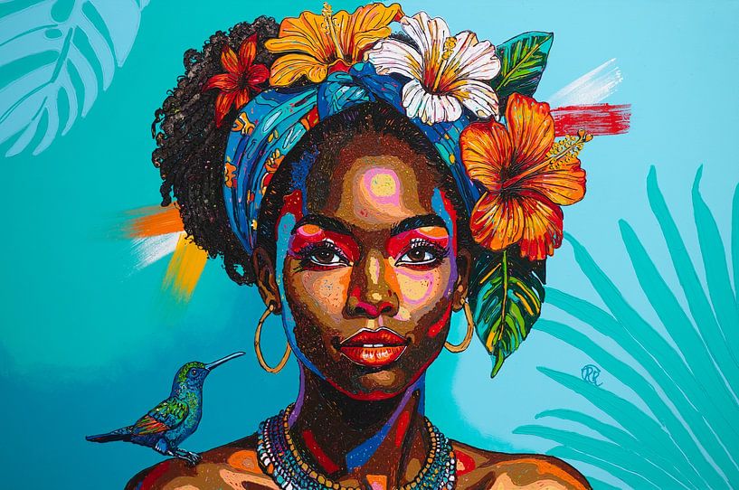 This painting depicts a powerful woman with a calm yet vibrant presence. Her gaze is direct and clear, as if she is fully present in the moment. The layered colours on her face, ranging from warm browns to vibrant accents of red, blue and yellow, create a dynamic and expressive whole that continues to captivate.