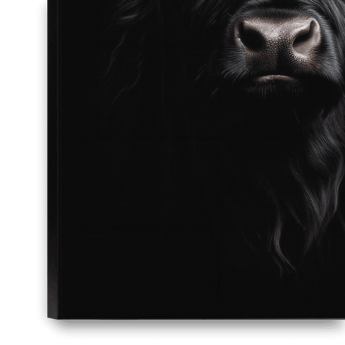 The portrait centres on a Scottish Highlander, a cow with impressive horns that reach upwards and exude a sense of strength and pride. The highlander's black coat blends seamlessly into the also black background, creating an almost ethereal effect. This creates a sense of mystery and elegance, as if the highlander is emerging from the…
