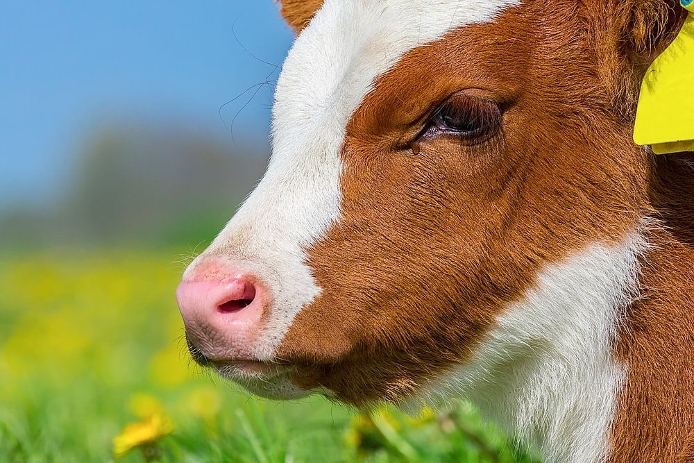 Portrait head of brown with white calf lying in meadow by Ben Schonewille