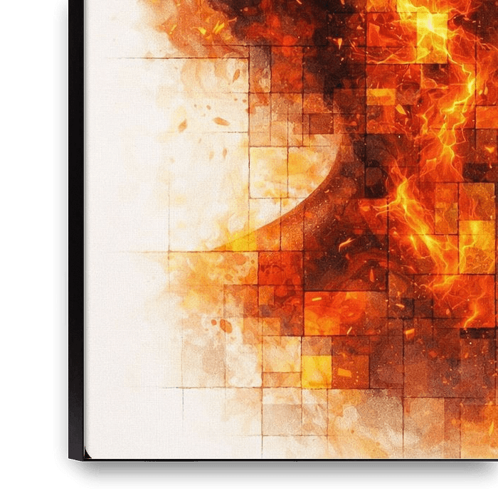 This artwork depicts a stylised portrait of a woman looking upwards, constructed from a mosaic of square shapes that blend seamlessly into fiery orange and yellow tones. The realistic facial features contrast sharply with the abstract, burning textures that seem to glow around the face. The warm colours – ranging from deep orange to…
