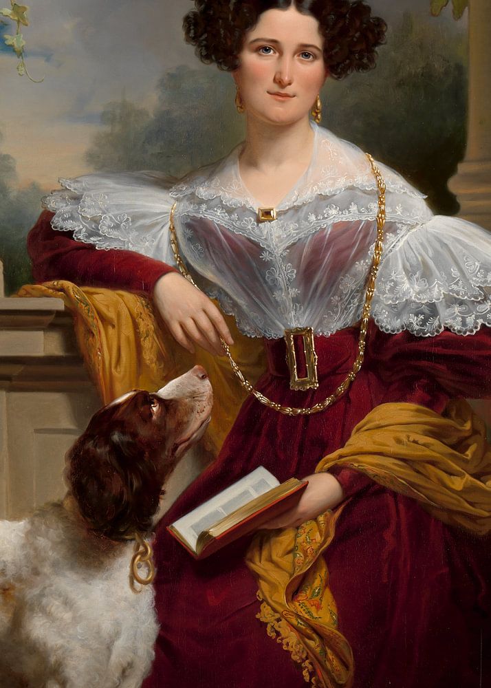 Reproduction of the portrait of Alida Christina Assink painted by Jan Adam Kruseman. The painting shows Alida with a hunting dog and surrounded by columns.