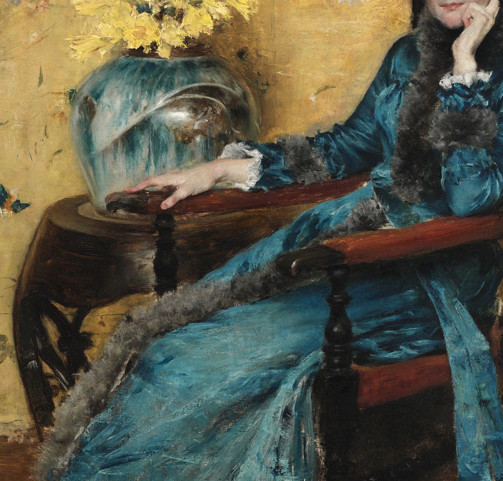 Dora Wheeler became Chase's first student when he returned from overseas study in Munich and set up a teaching studio in New York. At the time, few American artists accepted women as private pupils. After her course of study, Wheeler joined her mother in launching a successful decorating firm, one of the first businesses in the country to be operated entirely by women. For the firm, she designed luxurious textiles, and the embroidered silk tapestry that fills the background in her portrait references her occupational interest. Chase's portrait was awarded a gold medal at an international exhibition of contemporary art in Munich in 1883, and later that year was also shown in Paris. At some later point, the painting was acquired by the sitter, who subsequently donated it to the museum.
