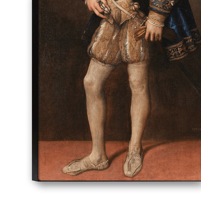 Philip is portrayed standing in a three-quarter pose, dressed in royal garments with the Roman Catholic Order of the Golden Fleece chain around his neck. Philip II’s left hand clutches his gloves as the hilt of his sword protrudes above. Titian captures the sovereign’s thoughtful and stern character, as Philip gazes resolutely beyond the presence of the viewer.