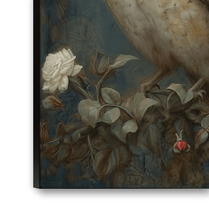 The image was created using a digital painting technique that approaches the softness and detail of traditional painting. Through subtle brushstrokes and nuanced colour transitions, the coat texture and depth in the feathers are beautifully expressed. The background is muted and blends harmoniously with the hues of the flowers, bringing the full focus to the owl and its intense gaze. The technique creates a timeless look, as if the owl lives in a dreamlike, fairy-tale setting.