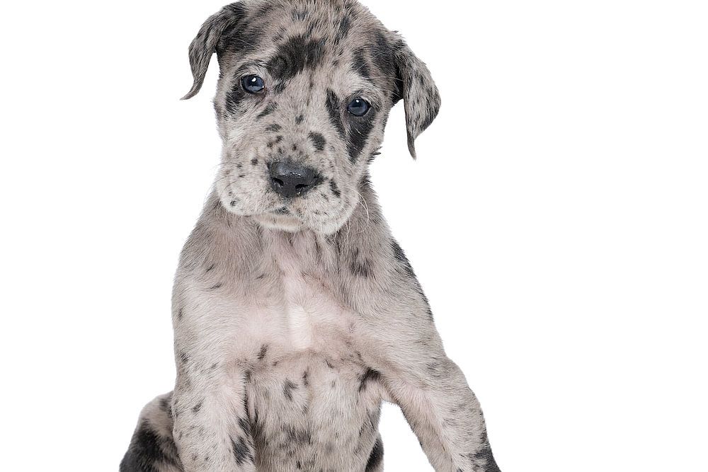 Portrait of a Dane or Great Dane puppy sitting against a white background
