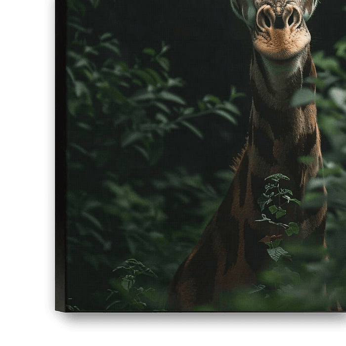 This breathtaking photograph captures the serene beauty of a giraffe in its natural habitat. The soft light filters through the foliage and casts an enchanting glow on the animal's fur. The giraffe stands majestically in the centre of the image, its long neck elegantly bent as it gazes into the distance. The composition of the picture is perfectly balanced, with the giraffe at the centre surrounded by lush greenery. This artwork adds a touch of exotic elegance to any space and invites wonder at the wonders of nature.