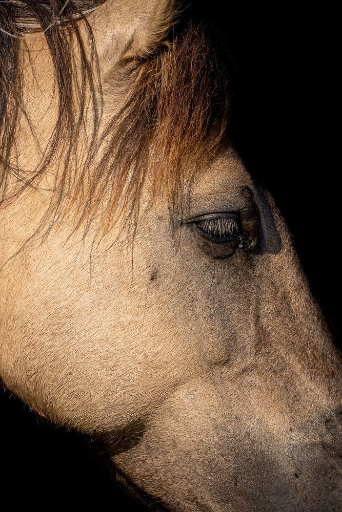 A portrait of a Konik horse (Equus caballus var. konik) on a black background. Shot at the Oostvaardersplassen.