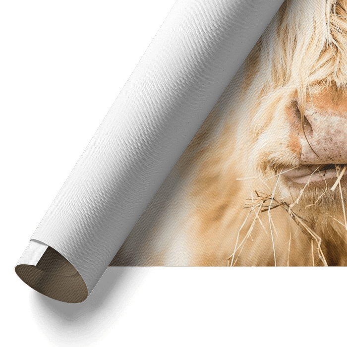Funny portrait of a Scottish Highlander in Scotland. It's as if he was caught while eating hay. You can find Scottish cows in several places in the semi-wild in Scotland and they are a nice addition to the landscape.