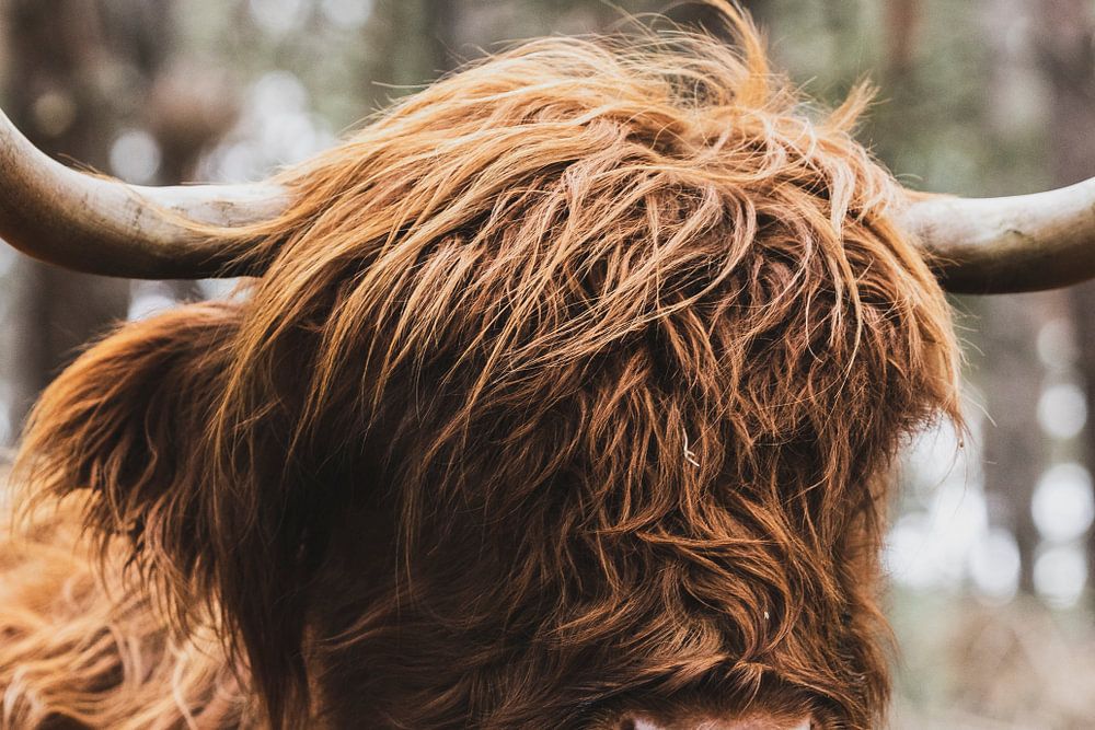 Portrait of a Scottish Highland cattle. The Scottish Highlanders are used in the nature conservation of the Veluwe to ensure that heather areas do not grow densely. The Highlander grazes undisturbed during a rain shower.