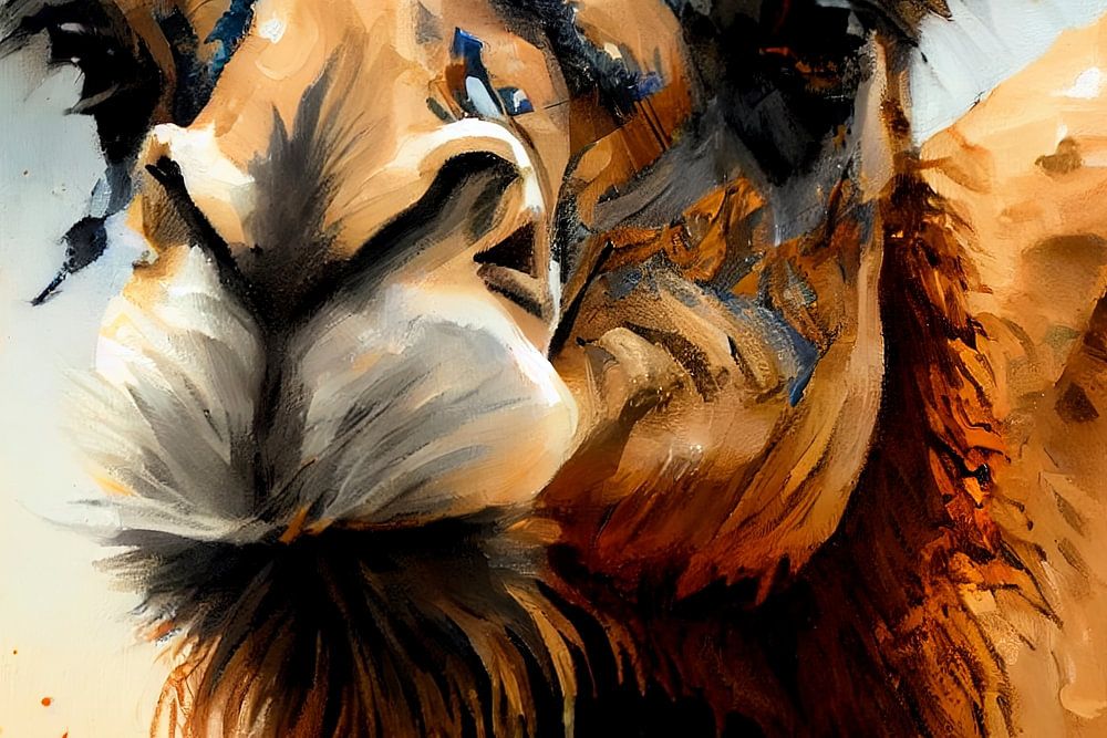 A digitally painted portrait of a Camel. The color palette and raw style of this work is inspired by rusty metal. This color palette combined with the paint splatters create a grungy and mysterious look. As a result, the work gives a modern industrial look to your interior!