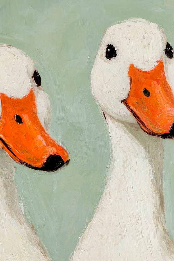Two charming ducks with bright orange beaks and large, inquisitive eyes look into the distance. Their feathery, snow-white plumage contrasts gently with the pastel-coloured background, which lends the scene a peaceful aura. Together they embody a feeling of togetherness and light-heartedness.