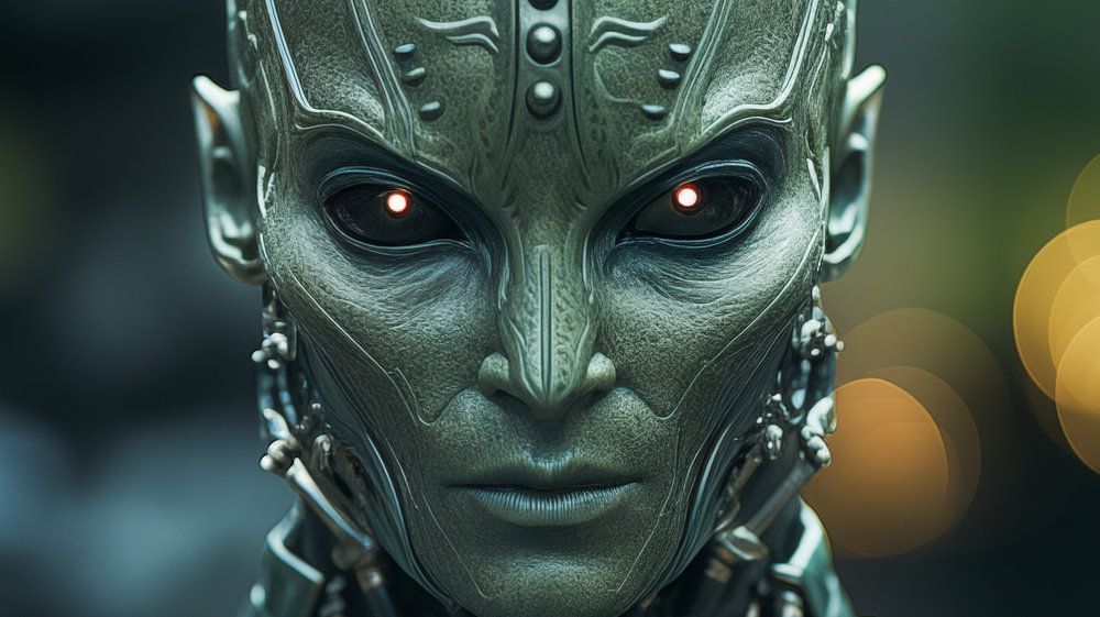 About "Portrait of a futuristic green alien machine cyborg man with yellow eyes"