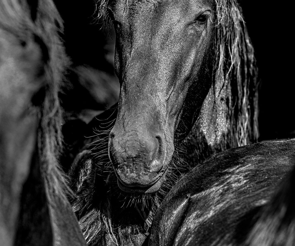Portrait of a horse in black and white flanked by two other horses for sharpness/depth and perspective.
