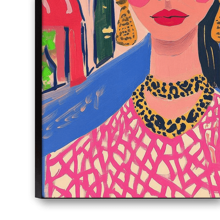 A cheerful and colourful figurative portrait with a Pop Art slant. The woman in bright pinks and reds stands against a vibrant background of a colourful city. This work exudes energy and boldness. This is a real eye-catcher that adds humour and personality to a space. It looks great in an eclectic or modern interior, or for example in a trendy clothes shop or café. For lovers of bright colours and an urban atmosphere.