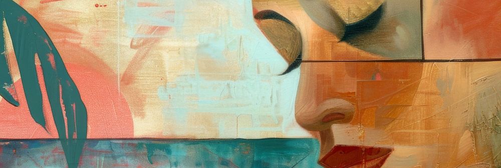 This fascinating painting in soft pastel colours shows a stylised portrait of a woman that impresses with its geometric shapes and smooth brushstrokes. The mixture of turquoise, pink and peach tones gives the painting a calm, almost dreamy atmosphere, perfect for creating an elegant colour accent in modern living rooms or offices. The subtle blending of the colours and the gentle transitions create a harmonious overall picture that captivates the viewer.