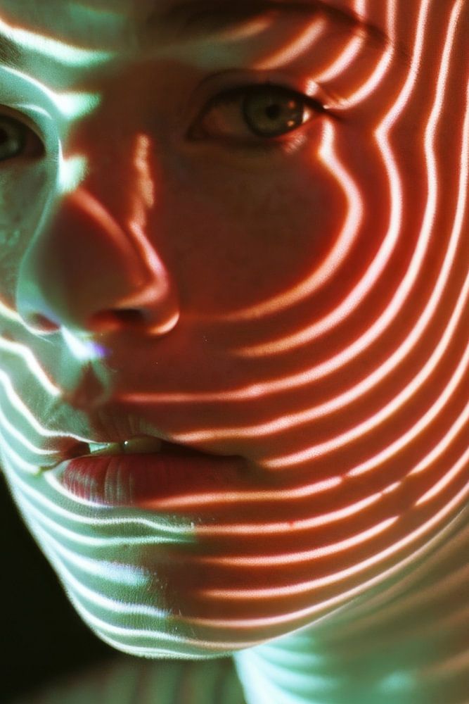 This mesmerising portrait shows a woman whose face is surrounded by enchanting patterns of light. The creative lighting creates a hypnotic interplay of light and shadow that emphasises the soft facial features and expressive eyes. The harmonious combination of points of light and soft contours gives the picture a mystical and artistic atmosphere. Ideal for lovers of portraits and modern art, this work will enchant your senses and add a unique aesthetic to any room.