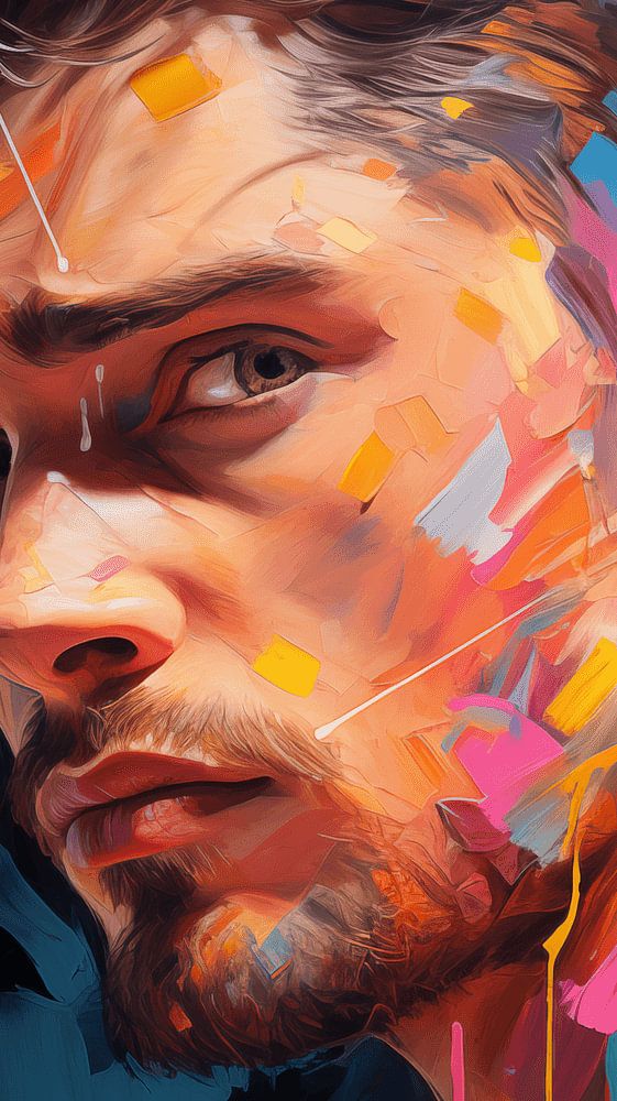 About "Portrait of a young abstract man with painted face, pop art body painting design vertical"