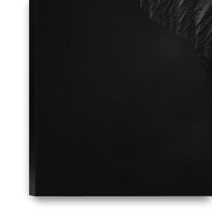 This powerful image shows a majestic elephant in all its glory, captured in a moment of serene power. The black and white colour scheme accentuates the deep wrinkles and rich textures of the elephant's skin, creating an almost tangible sensation. The dark background beautifully highlights the animal's details, adding to the dramatic…