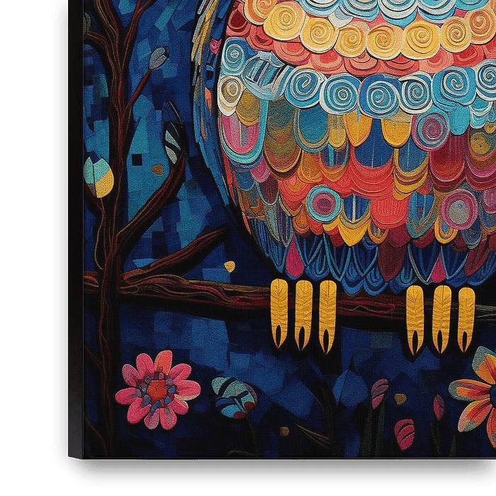Portrait of an Owl is a digital painting of an owl with big eyes. The work's vibrant colours and details excite the senses and bring life to any room.