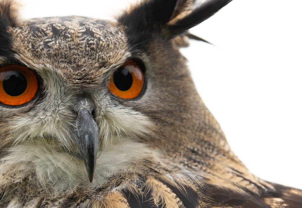 Portrait of an eagle owl with orange eyes by Heleen Schenk / Smeerjewegproducties