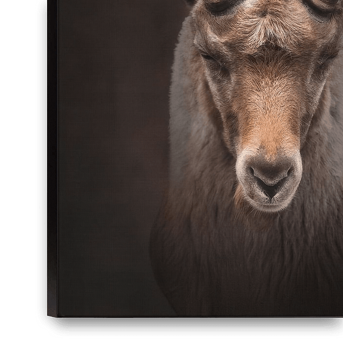 This fine-art portrait shows an imposing alpine ibex, an animal that symbolises the rugged beauty of the Swiss and Austrian Alps. Its robust head and impressive, curved horns immediately attract attention. The ibex exudes strength and calm, with a gaze that is both curious and fearless.